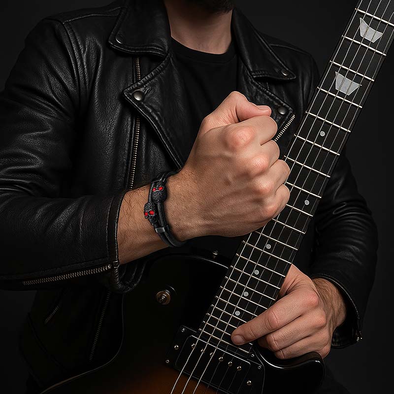Das Highlight: zwei schwarze Schädel-Elemente aus Edelstahl, besetzt mit funkelnden roten Zirkonia-Steinen, die wie glühende Augen wirken und dem Design eine elektrisierende Intensität verleihen.